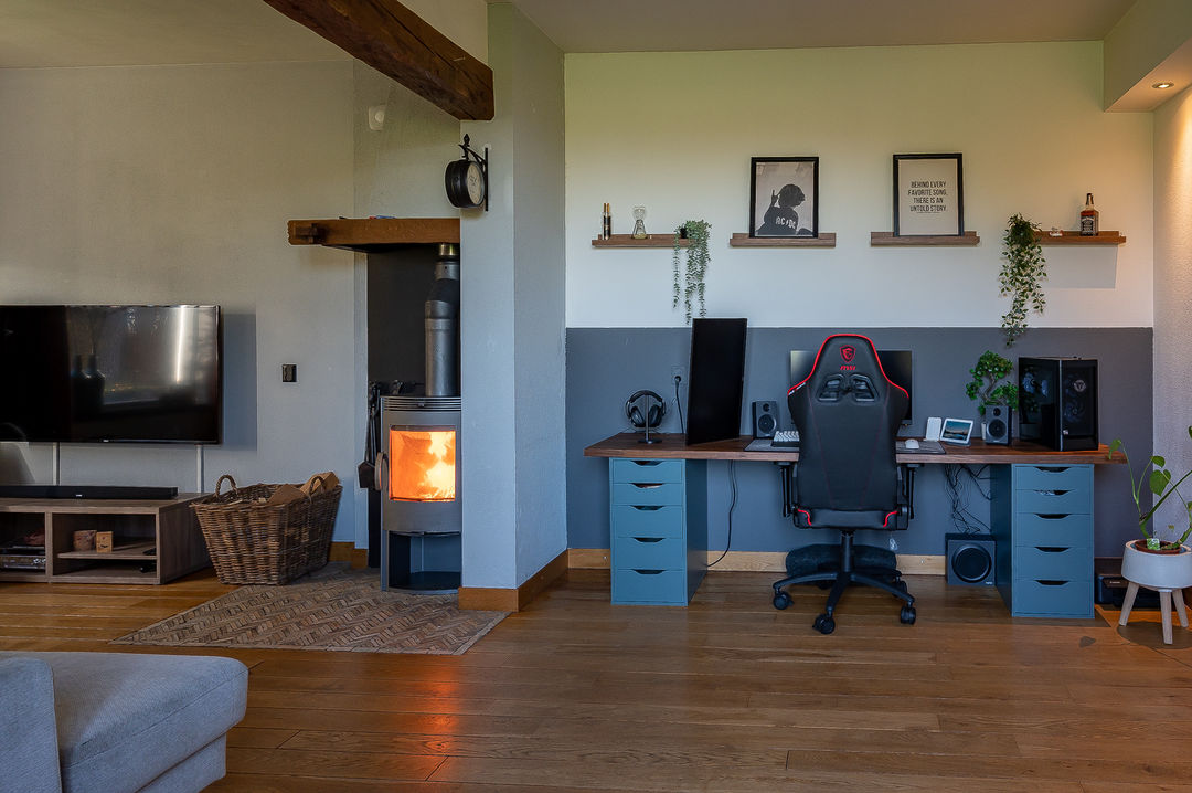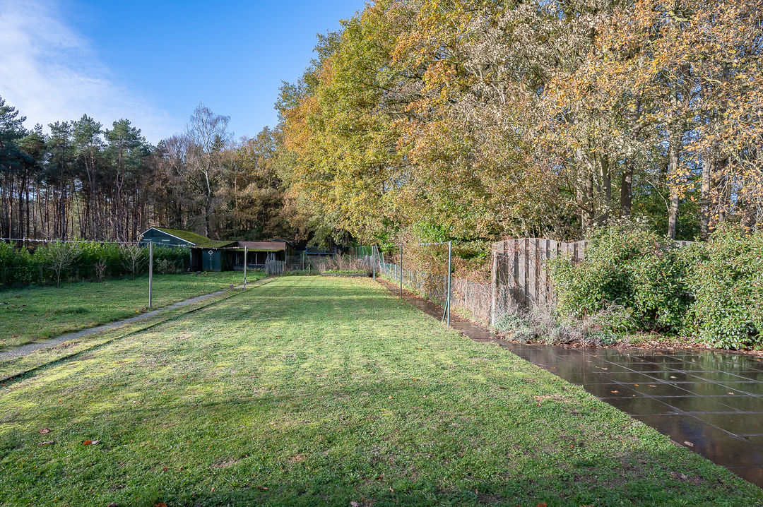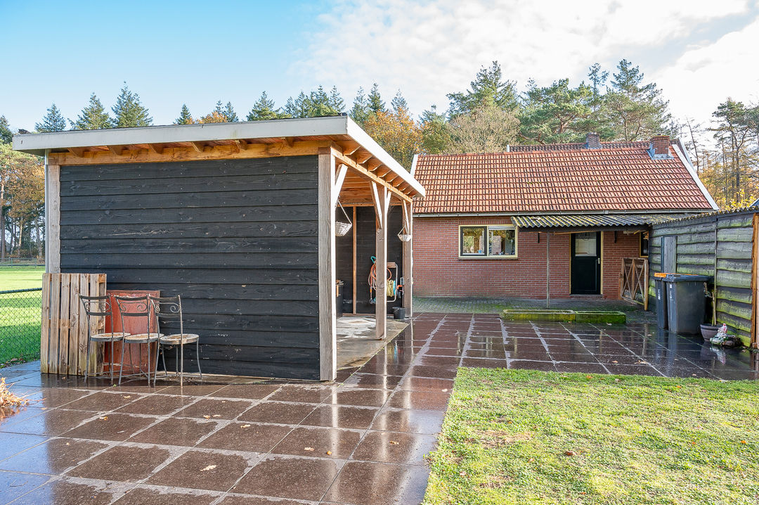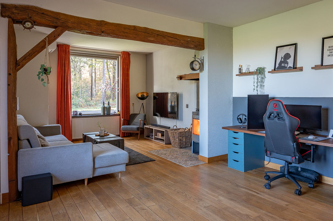 Begane grond: entree/hal, L-vormige sfeervolle woonkamer met eiken vloerdelen en airco (2022), houtkachel en prachtig uitzicht op het bos, royale woonkeuken met inbouwapparatuur (o.a. inductiekookplaat, combimagnetron, koelkast en vaatwasser van 2022) en granitovloer. Vanuit de keuken is er een uitzicht over de weilanden. Verder is op de begane grond een nette badkamer met ligbad, inloopdouchecabine en wastafel, ruime bijkeuken met C.V.-opstelling, toiletruimte.